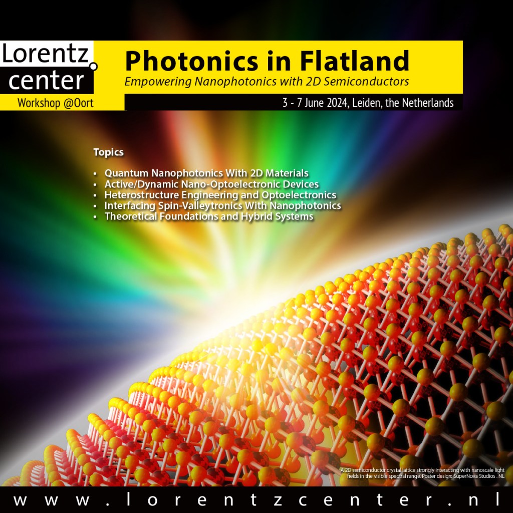 The workshop Photonics in Flatland: empowering nanophotonics with 2D semiconductors will take place in Leiden, The Netherlands, during June 3-7, 2024. It is supported by the Lorentz Center and organized by Jorik van de Groep, Isabelle Staude, Sonia Conesa-Boj, Zhipei Sun, and Alberto Curto.